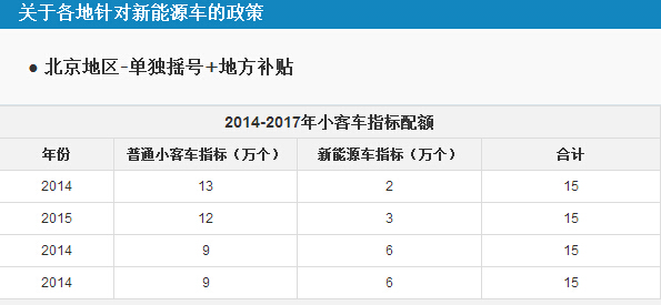 根據(jù)北京市的現(xiàn)行政策,購買新能源小客車的消費(fèi)者也需要進(jìn)行搖號(單獨(dú)搖號池)。由于2014-2017年北京市購車年度配置指標(biāo)總量減少到每年15萬個(gè)(包括個(gè)人及單位)。在指標(biāo)結(jié)構(gòu)構(gòu)成上增加示范應(yīng)用新能源小客車指標(biāo)類別并逐年增加所占比例,按2萬、3萬、6萬、6萬的漸進(jìn)式發(fā)展。設(shè)立單獨(dú)的搖號池配置示范應(yīng)用新能源小客車指標(biāo)。個(gè)人申請條件與申請普通指標(biāo)的條件一致。若申請數(shù)量少于當(dāng)期示范應(yīng)用新能源小客車指標(biāo)配額,則直接配置。