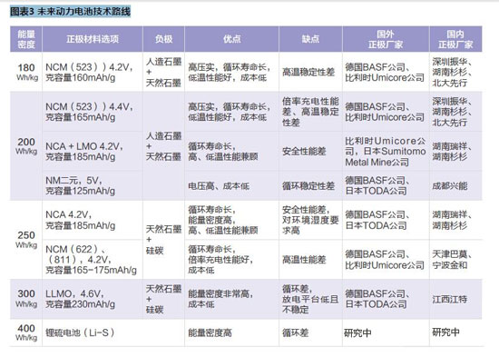 根據2011年NEDO公布消息,日本政府已集合多所大學及企業進行高能量密度電池的研究,計劃到2020年達到250Wh/kg(可支持電動車行駛300 公里),2030年達到500Wh/kg(可替代傳統燃油汽車的水平)。當前,我國較好的磷酸鐵鋰電池能量密度可以達到 130Wh/kg,能夠支持行駛130公里。高比能正、負極材料開發是未來動力電池比能量大幅度提升的主要途徑。我國部分電池企業正進行下一代電池的研發,采用三元材料與改性錳酸鋰等,預計2015年上半年量產動力電池能量密度可達180Wh/kg,不額外增加電池數量情況下可支持續駛里程達到200公里。技術路線上,按照未來動力電池的能量密度高低來劃分,可分為以下幾類。