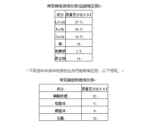 電池中有多種重金屬污染物,但是這些污染物大多都有經(jīng)濟(jì)價值。目前常用的鋰離子電池正極材料有 LiCoO2,LiNiO2,LiMn2O4,LiFePO4和三元材料等,正極材料、乙炔黑導(dǎo)電劑與有機(jī)粘合劑涂覆于鋁箔上構(gòu)成正極,負(fù)極主要是由片狀碳材料、無定形碳材料涂覆于銅箔上構(gòu)成。電解質(zhì)溶液中的電解質(zhì)鹽一般為 LiCF3SO3,LiBF4和LiPF6等鋰鹽,常用的溶劑有碳酸乙烯脂(EC)、碳酸丙稀脂(PC)、碳酸二甲脂(DMC),甲基乙基碳酸酯(EMC)等。
