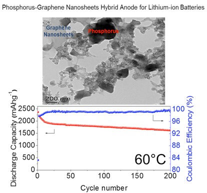 針對這一問題,最近美國賓夕法尼亞州立大學(The Pennsylvania State University)王東海教授領導的,以于昭新、宋江選為主的科研梯隊發明了一種新型鋰離子電池負極材料:“紅磷-石墨烯”納米復合材料。該種材料是由紅磷和石墨經球磨制備得到。紅磷化學穩定性高,廉價易得,而且對環境污染小。其作為鋰離子電池負極材料的理論容量可達2600 mAh/g,是商用石墨電極的7倍。 石墨/石墨烯因其極高的電子電導率被引入到該體系中以提升納米復合材料整體的電子電導率。在高速球磨過程中,微米級的紅磷顆粒被打碎至納米級。石墨在球磨 過程中剝離為大比表面積的石墨烯。經過長時間機械力作用,石墨烯相互搭接形成一個緊密結合的三維導電網絡,而納米級紅磷顆粒均勻分散在該網絡中。紅外光譜 (Infrared Spectroscopy)測試顯示,紅磷和石墨烯以“磷-氧-碳 (P-O-C)”的化學鍵形式結合在一起,這又為該材料出眾的電池性能提供了保證。在室溫下,該納米復合材料的放電容量可達1400mAh/g,4倍于現行商用化鋰離子電池負極材料——石墨。 經過300周的循環,放電容量仍然能保持在60%以上。高溫環境(60°C)對于現行商用鋰離子電池仍是很大的挑戰。而該種材料在60°C下,放電容量可進一步提升至1650mAh/g。經過200周循環,放電容量保持率可在70%以上。