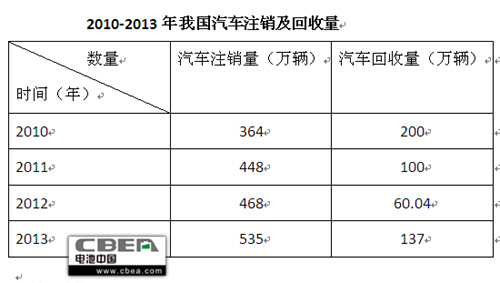 “回收難”是困擾我國報廢汽車產(chǎn)業(yè)的痛點。從我國汽車報廢量來看,我國已開始逐步進(jìn)入汽車報廢的高峰期。2010—2013 年我國汽車注銷量分別約為 364 萬輛,448 萬輛,468 萬輛,535 萬輛,但2010—2013 年的回收量分別約為 200 多萬輛,100 多萬輛,60.04 萬輛,137 萬輛(見下表)。