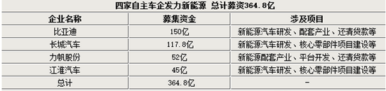 比亞迪汽車、長城汽車、力帆汽車以及江淮汽車四家自主車企,計劃通過募資形式發展新能源汽車產業。其中比亞迪募集資金最高,達到150億元,緊隨其后的是長城汽車計劃募集117.8億元,力帆汽車和江淮汽車分別計劃募資52億和45億元。