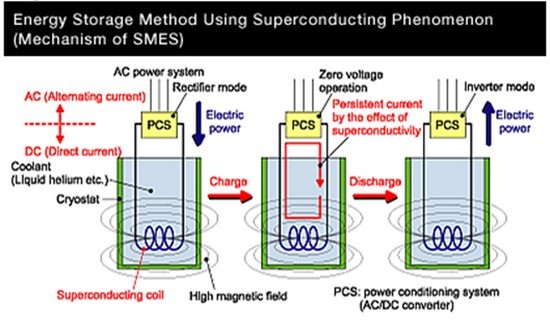 超導(dǎo)儲(chǔ)能系統(tǒng)是由一個(gè)用超導(dǎo)材料制成的、放在一個(gè)低溫容器(cryogenic vessel) (杜瓦Dewar )中的線圈、功率調(diào)節(jié)系統(tǒng)(PCS)和低溫制冷系統(tǒng)等組成。能量以超導(dǎo)線圈中循環(huán)流動(dòng)的直流電流方式儲(chǔ)存在磁場(chǎng)中。