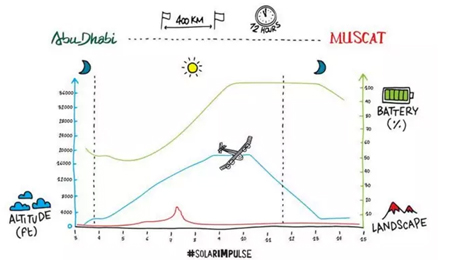 我們都知道,陽光動力2號是一架依靠太陽能供電飛行的飛機,為了保證充分接觸陽光,它每天日出前就必須從1000米的巡航高度爬升至8500米的云層上方,在吸收陽光、充飽電池之后,再在夜晚下降到空氣阻力更小的低海拔高度,以減少飛行中的能量損失。