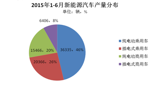 從車型分布來看,純電動乘用車仍是整個新能源汽車市場的主力車型,2015年上半年生產(chǎn)36355輛,占總體產(chǎn)量的45%。其次是插電式乘用車生產(chǎn)20366輛,占比26%。新能源乘用車整體占比由去年的65%提升了7個百分點,私人市場進(jìn)一步擴大。