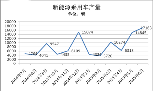 5月、6月的產(chǎn)量再次穩(wěn)固了對新能源乘用車市場的信心。5月生產(chǎn)14845輛,環(huán)比增長135%;6月生產(chǎn)17163輛,環(huán)比增長15.6%。至此,新能源乘用車2015年1-6月累計生產(chǎn)5.67萬輛,已超過去年全年5.45萬輛的產(chǎn)量。