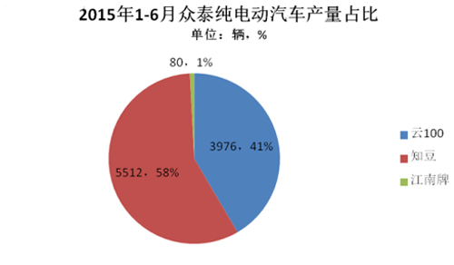 眾泰2015年1-6月生產(chǎn)電動汽車9568輛。旗下主推的車型有眾泰知豆和云100,另外以江南奧拓為原型打造的電動汽車也開始生產(chǎn)。