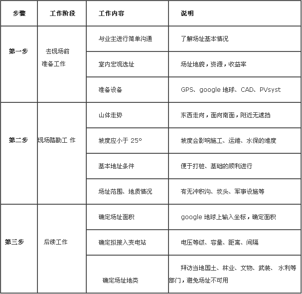 對項目土地(及其周邊)資源、電網(wǎng)情況、當?shù)卣叩冗M行摸底考察。我把現(xiàn)場選址工作劃分成三步,如下表所示: