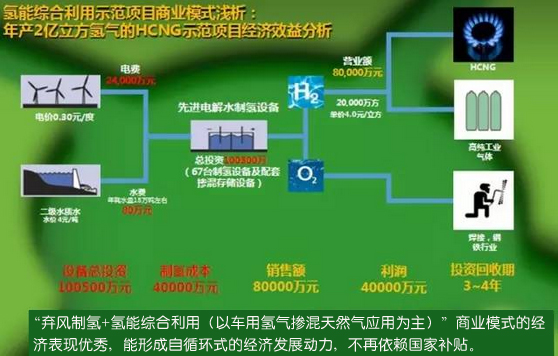 棄風制氫+氫能綜合利用的節能減排效益:2013年度蒙西網棄風電40億度,可年產氫氣10億立方米;2014年全國棄風電量133億度,可年產氫氣33億立方米;±800kV特高壓輸送電量500億度,可年產氫氣125億立方米。假設全部用于HCNG,制備過程不產生任何廢棄物,物理摻混,無碳排放,循環全綠色。