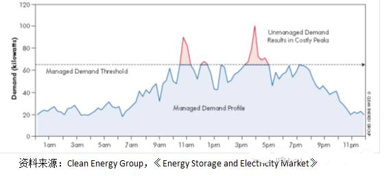在運(yùn)行時(shí),GreenStationTM儲(chǔ)能系統(tǒng)中的能量管理系統(tǒng)首先持續(xù)記錄并分析用戶(hù)的用電行為,結(jié)合當(dāng)?shù)氐碾妰r(jià)政策生成合理的充放電策略,通過(guò)低谷蓄電、高峰放電行為,削減用戶(hù)的高峰用電功率,從而達(dá)到削減需量電費(fèi)的目的。