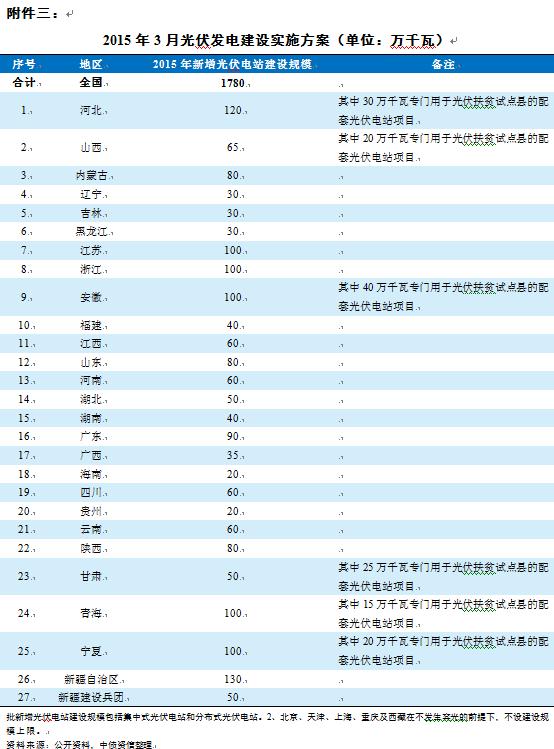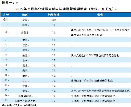 9月末,國(guó)家能源局發(fā)布《調(diào)增部分地區(qū)2015年光伏電站建設(shè)規(guī)模的通知》(以下簡(jiǎn)稱《通知》)調(diào)增2015年光伏電站建設(shè)規(guī)模530萬(wàn)千瓦,較3月公布的1780萬(wàn)千瓦的目標(biāo)增加近30%。《通知》明確,新增光伏電站建設(shè)規(guī)模主要用于支持光伏電站建設(shè)條件優(yōu)越、已下達(dá)建設(shè)計(jì)劃完成情況好以及積極創(chuàng)新發(fā)展方式的新能源示范城市、綠色能源示范縣等地區(qū)建設(shè)光伏電站。合計(jì)共14個(gè)省份和新疆生產(chǎn)建設(shè)兵團(tuán)獲得調(diào)增計(jì)劃,其中光照條件優(yōu)越的西北地區(qū)、已下達(dá)建設(shè)情況完成較好的內(nèi)蒙古等地以及安徽等建設(shè)新能源示范城市的地區(qū)獲得調(diào)增規(guī)模較大。