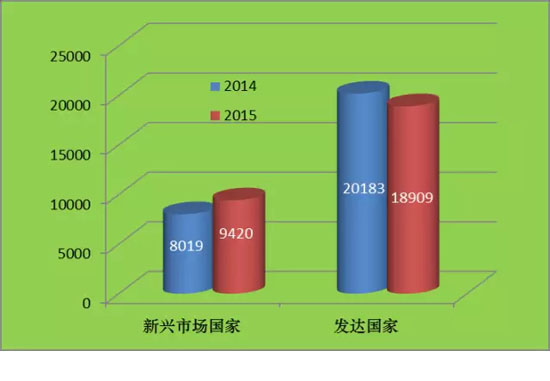 圖4 2014、2015“500強”發(fā)達國家與新興市場國家上榜企業(yè)總營業(yè)收入(單位:億元)