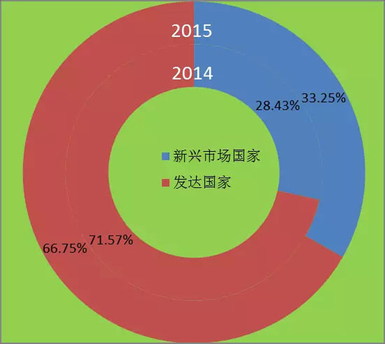 圖5 2014、2015“500強”發(fā)達國家與新興市場國家上榜企業(yè)總營收占比圖
