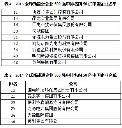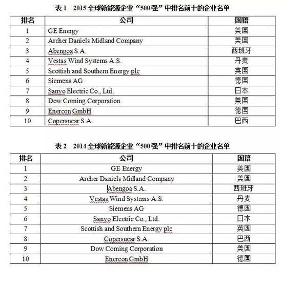 2015“500強”排名前十的企業(yè)依次為GE Energy(美國)、Archer Daniels Midland Company(美國)、Abengoa S.A.(西班牙)、Vestas Wind Systems A/S(丹麥)、Scottish and Southern Energy PLC(英國)、Siemens AG(德國)、Sanyo Electric Co., Ltd.(日本)、Dow Corning Corporation(美國)、Enercon GmbH(德國)和Copersucar S.A.(巴西)。連續(xù)2年,前十的企業(yè)中都出現(xiàn)了新興市場國家企業(yè)的身影,而不再是由發(fā)達國家企業(yè)獨霸。由此可見,新興市場國家企業(yè)的競爭力增強,其與發(fā)達國家的差距正減少。
