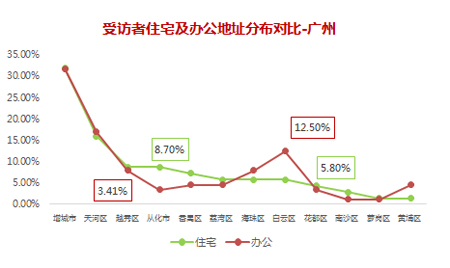 廣州受訪者范圍覆蓋了12個城區,其中增城市、天河區、的受訪者人數最多。