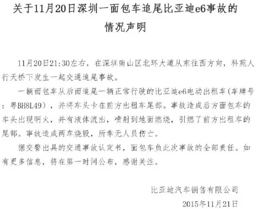 就在事故發(fā)生后的第二天,11月21日,比亞迪在其官方微博發(fā)布關(guān)于11月20日深圳一面包車追尾比亞迪e6事故的情況聲明,11月20日深圳科苑人行天橋下發(fā)生一起交通追尾事故。事故造成兩車燒毀,所幸并未人員傷亡。據(jù)交警出具的交通事故認(rèn)定書(shū),面包車負(fù)此次交通事故的全部全責(zé)。