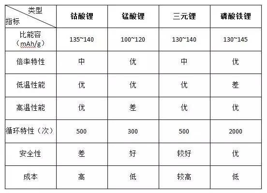 這三點(diǎn)是目前鋰離子電池的共性問題,所以鋰離子電池就像個(gè)矯情的小公舉,使起性子來就得“大保健”伺候著。但是不同的鋰離子電池中也存在差異性。我們通過一張表格來對(duì)比一下: