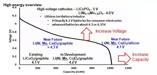 圖2 鋰離子電池比能量提升路徑(提高電壓或/和提升比容量)示意圖(摘自日本大金報告)