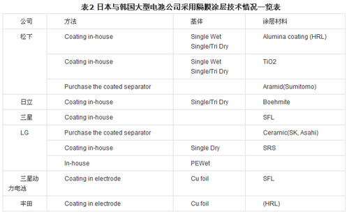 表2列出了國外幾家電池制造商采用隔膜涂層技術的情況。