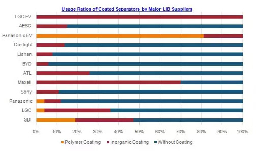 圖7 各國大型電池企業采用和未采用涂層隔膜的比例圖(取自呂學隆報告)