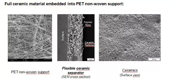 本次論壇上,德國Litarion公司一直采用PET無紡布基體制造填充有陶瓷Al2O3的隔膜,如圖8所示。這種隔膜早期在中國推廣過,但是沒有取得實際應用進展。目前這種隔膜及其電極被用于他們與一家電動汽車公司(Electrovaya)合資的電池公司所制造的動力電池,再由Electrovaya制造成動力電池包,供電動車輛采用。其40 Ah電池以1C充放電,100% DOD下可達到9000次,容量保持在30Ah;單體電池能通過180℃烘箱以及針刺實驗,沒有安全問題發生。