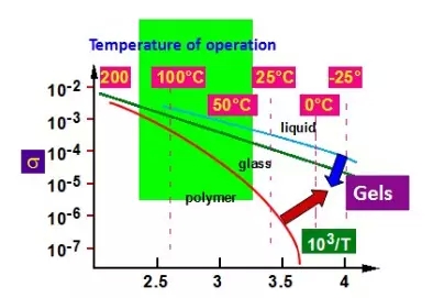 圖12 典型無機鹽固體電解質(glass)、有機聚合物電解質(polymer)和有機液體電解質的電導率與溫度關系圖(取自Armand報告)