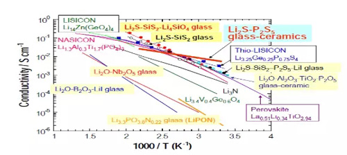 顯然,無機鹽電解質的室溫電導率明顯高于聚合物電解質,25℃下的電導率最高值可超過10-3Scm-1。從電導率數值來看,更有利于研制室溫工作的全固態電池。