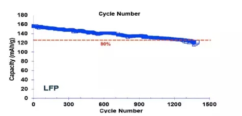 圖16顯示出這種電池的循環壽命數據,已經可以接近1500次,正極比容量從約158mAh/g降低至約120mAh/g。