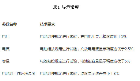 a、顯示精度。電池組配有專用電池管理系統(tǒng)(BMS),BMS顯示的各種參數(shù)值與電池組實際的參數(shù)值之間的誤差應符合表1的要求。