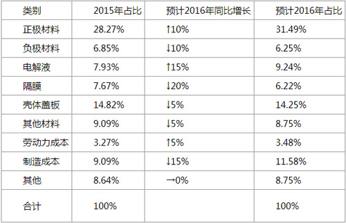 其他部分主要指資金使用成本和環(huán)保成本。目前電池企業(yè)大都在擴(kuò)產(chǎn),而企業(yè)的盈利能力根本不足以支撐這種擴(kuò)張,因此,資金的使用成本很難下降,同時(shí),在環(huán)境壓力越來(lái)越大的現(xiàn)實(shí)狀況下,環(huán)保成本毋庸置疑也不可能下降。這些成本2016年不上升就不錯(cuò)。筆者這里預(yù)計(jì)保持2015年的水平。