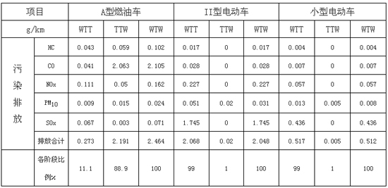 是否所有電動汽車都比燃油車更環保?汽車的生命周期評估中引入了汽車尾氣中的非甲烷烴(NMHC)、氮氧化物(NOx)、懸浮顆粒物(PM)、硫氧化物(SOx)等排放量的計算。為了便于比較,增加小型電動車的廢氣排放分析,取樣為整備質量為400 kg的小型電動汽車,經濟性指標目標值為5kWh/100 km。根據電力行業火電廠平均供電標準煤耗及SOx排放等指標,基本結果分析如下: