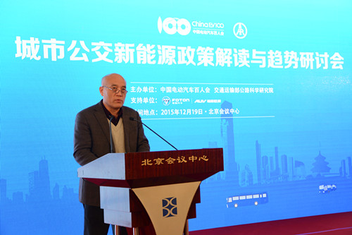 2015年12月19日,由中國電動汽車百人會與交通運輸部公路科學研究院聯合舉辦的“城市公交新能源政策解讀與趨勢研討會”在北京召開,國務院發展研究中心原黨組書記陳清泰、交通運輸部運輸服務司副司長王水平、工業和信息化部裝備工業司副巡視員瞿國春、中國道路運輸協會城市客運分會理事長張國光、中國電動汽車百人會執行副理事長歐陽明高等參加會議并講話。