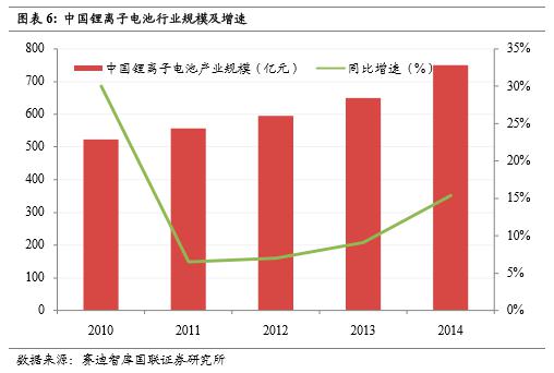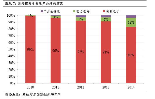 2014 年電動汽車動力電池在鋰電池中的占比為16%,已經成為手機、便攜式電腦之后的第三大 應用領域。動力電池占比呈現加速增長的態勢:
