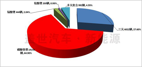 當(dāng)月所生產(chǎn)的純電動客車,采用磷酸鐵鋰動力電池的數(shù)量是14143輛,占據(jù)64.9%的份額,位居第一;三元材料動力電池的裝機量為6022輛,占總份額的27.6%;多元復(fù)合材料動力電池、錳酸鋰動力電池、鈦酸鋰動力電池所占當(dāng)月份額分別為4.55%、2.04%、0.93%。
