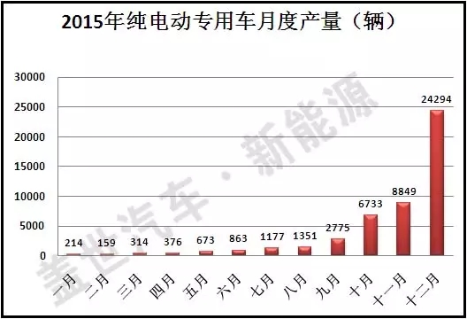 得益于國家政策和地方政策,純電動(dòng)專用車的發(fā)展更加給力。其中1月份產(chǎn)量為214輛,2月份159輛,3月份314輛,4月份376輛,5月份673輛,6月份863輛,7月份1177輛,8月份1351輛,9月份2775輛,10月份6733輛,11月份8849輛,12月份24294輛。環(huán)比增長(zhǎng)率分別為﹣26%、98%、20%、79%、28%、36%、15%、105%、129%、31%、175%。
