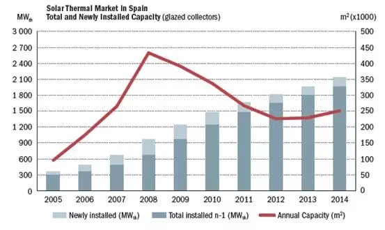 在連續(xù)四年的市場衰退之后,西班牙光熱市場終于進入了穩(wěn)定發(fā)展期。2014年底,西班牙集中式光熱發(fā)電裝機共計2.24 GWth,全年平均增速9%。