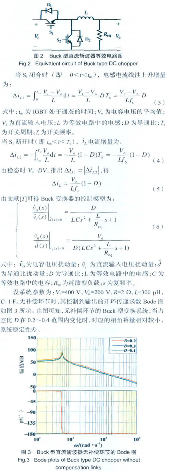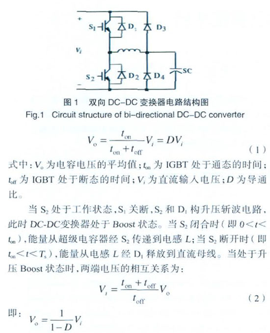 雙向DC-DC變換器是直流母線和超級(jí)電容器之間的一個(gè)周期性通斷的開關(guān)控制裝置,它的作用是改變供給超級(jí)電容器的電壓,實(shí)際上是作為一個(gè)電壓調(diào)節(jié)系統(tǒng)而工作的。