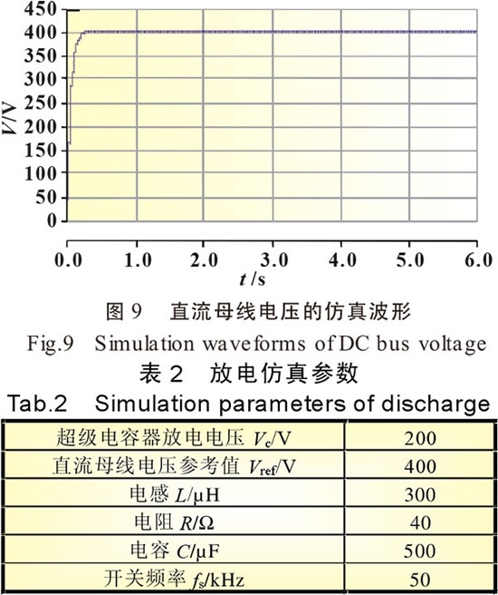 在PSCAD/EMTDC電力系統(tǒng)仿真軟件中建立了超級(jí)電容器以電壓為控制量的恒壓放電仿真模型。仿真參數(shù)見表2。仿真圖形見圖9。