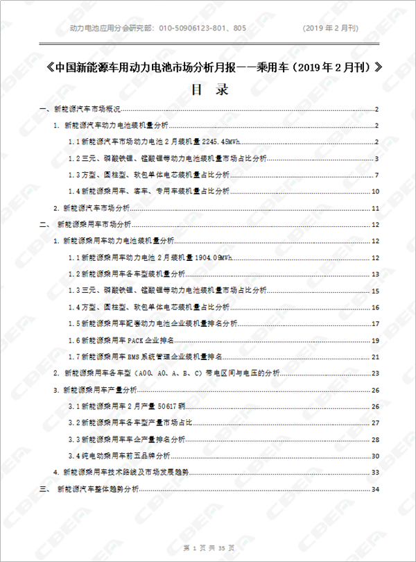 《2019中國新能源車用動力電池市場分析月報——乘用車(2月刊)》目錄